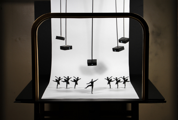 Ir izveidota scenogrāfijas iecere un makets Pētera Čaikovska baletam “Gulbju ezers”. Scenogrāfiskais risinājums paredz iekonservētu, 19.gs romantiskā baleta tradīcijās ieturētus kostīmus un dejotāju izpildījumu tuvu oriģinālajai 1895. gada Mariusa Petipā un Ļeva Ivanova horeogrāfijai. Izrādes vizuālo ietērpu veido projekcijas un paši projektori. Virs dejotāju galvām ir vēl viens - projektoru - balets, kurš dzīvo līdzi baleta tēlam ļaunajam ģēnijam Rotbartam. Projektori dara fantastiskas lietas un pārvērš darbības vietas un laiku kā uz burvju mājiena, noklājot skatuvi te ar dekoratīvu dārza plānu, te ar karti, kurā redzams ezers, tādā veidā arī kontrolējot situāciju un attīstot sižetu. Izrādes gaitā mīlētāji, nonāvejoties, salauž Rotbarta lāstu un izrādes beigās ļaunums projektoru veidolā vairs nedarbojas, projektori ir nolaidušies un guļ uz skatuves grīdas.